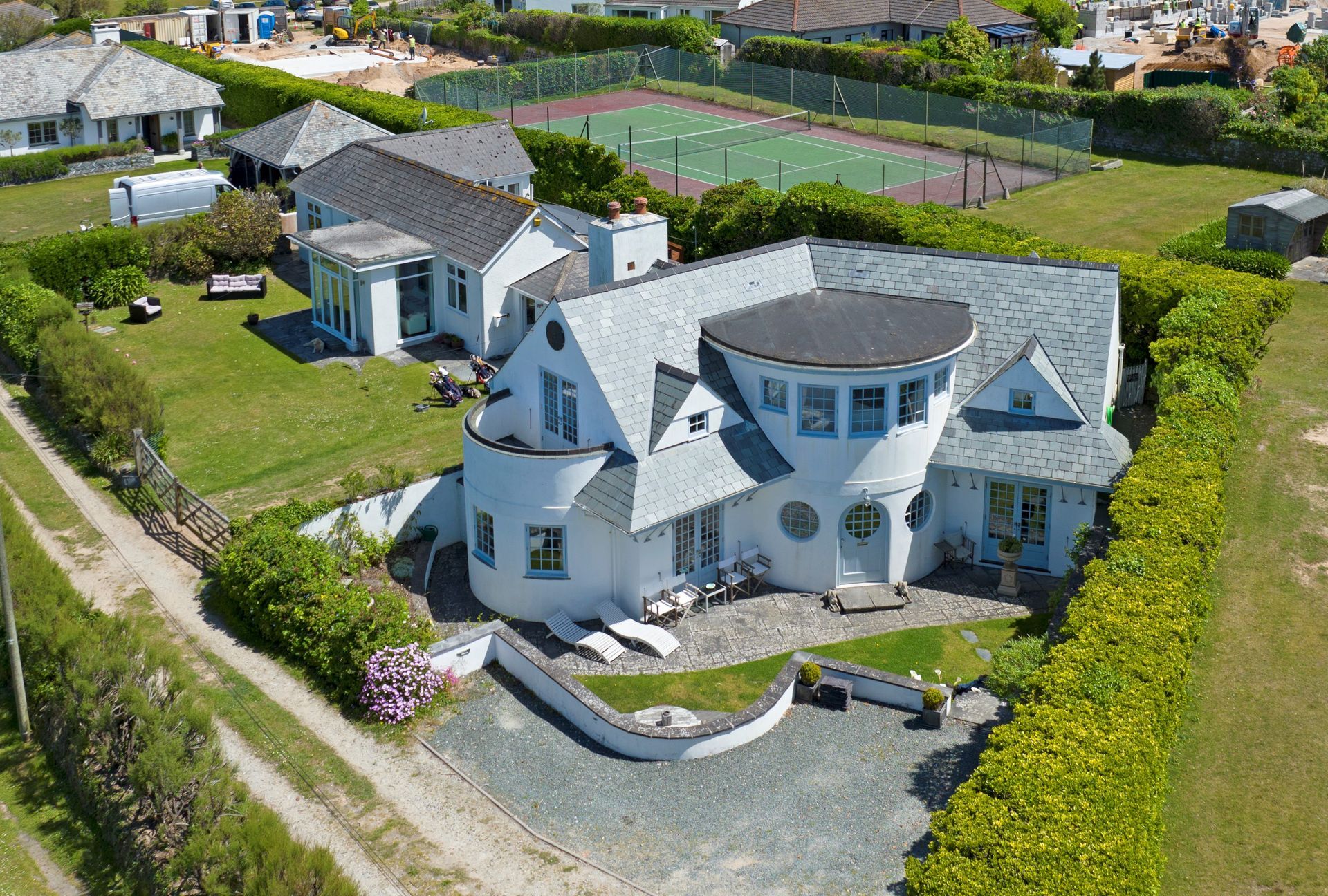 A Voyseyan style property in Constantine Bay, dug into the ground to maintain a low roof line, from